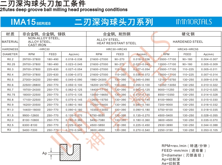 深沟球刀通常为2刃螺旋槽,对沟槽进行曲面精密加工的数控刀具。主要用于CNC、电脑锣、钻攻加工机、精雕机、钻床、自动车床、走刀机或走芯机等数控车床对工件进行外圆或棱边倒角加工的数控刀具。具有加工效率高、加工速度快、加工精度高,工件表面粗糙度好以及高导屑,高进给,较长使用时间等特点,适用于干式切削和冷却式切削。
